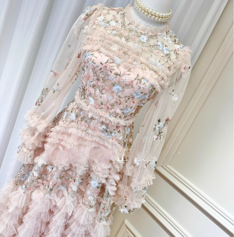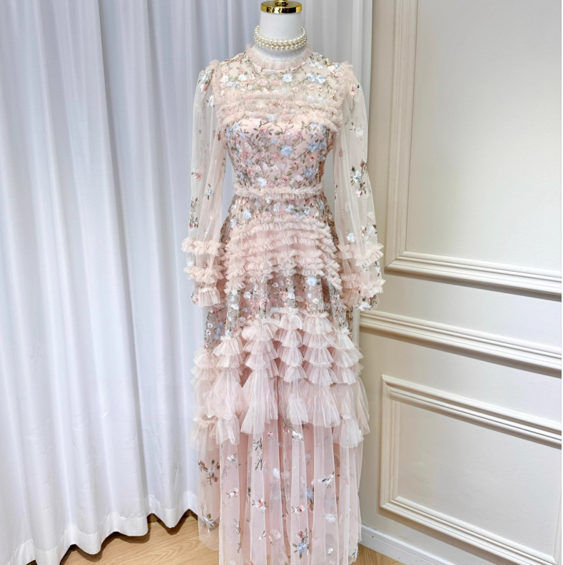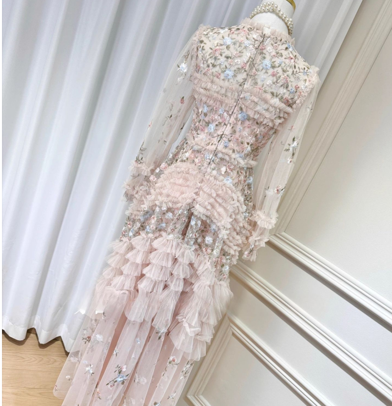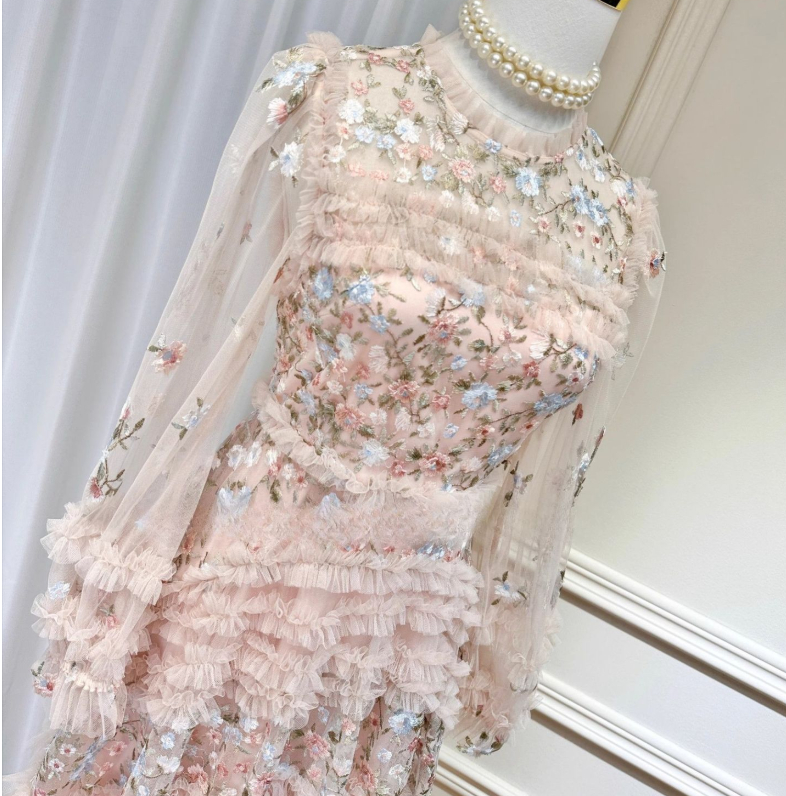 French fairy heavy embroidery flowers slightly transparent puff sleeve waist wood ear edge cake long skirt